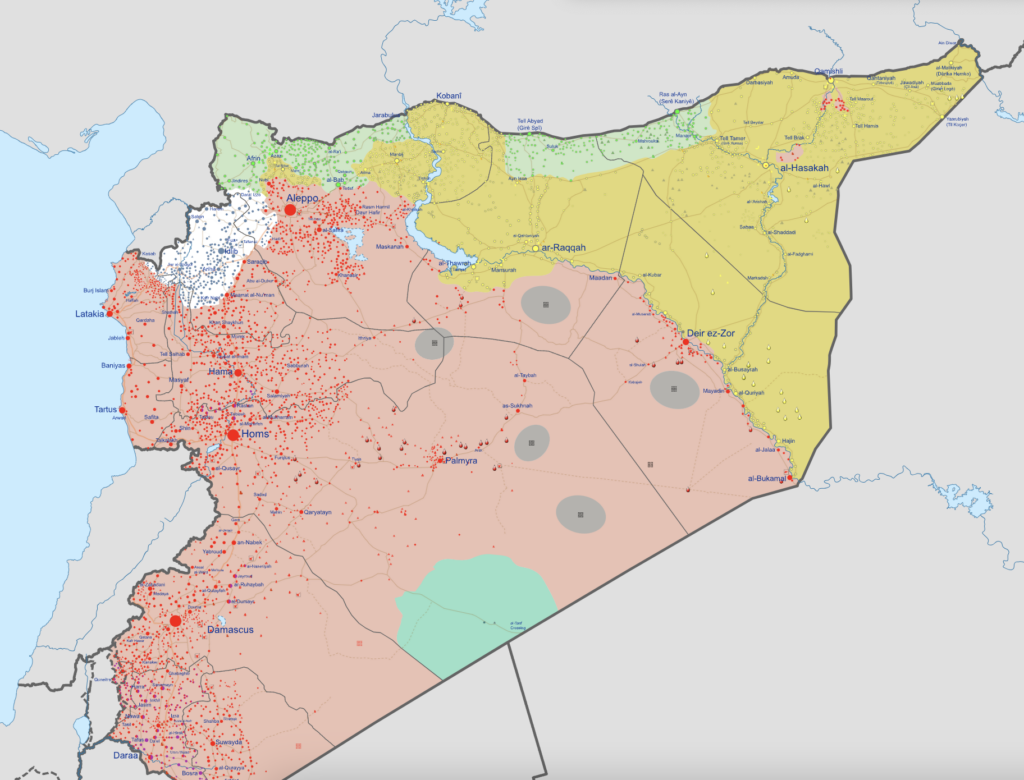 Picture 1: Military situation after the fall of the Assad regime in December 2024. Territories held by the Syrian Democratic Forces – the Kurds (yellow), IS (grey), the Syrian uncertain/mixed (red/light grey), the SNA and Turkey (light green), SOR (pink), Tahrir al-Sham (white), the SFA and the United States (teal).